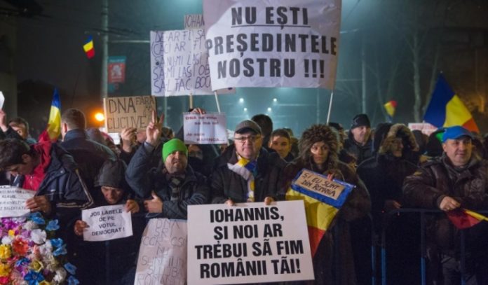 Oamenii scandează „Demisia, Demisia” şi ”Jos Iohannis!”, acuzându-l pe șeful statului că i-a dezbinat pe români.