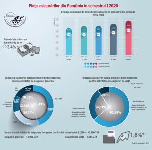 Creșterea volumului de prime brute subscrise, în primele șase luni ale anului 2020 comparativ cu perioada similară a anului anterior, se datorează exclusiv dinamicii pozitive înregistrată în trimestrul I 2020, când volumul acestora a ajuns la cea mai mare valoare trimestrială din ultimii ani (2,95 miliarde lei). În trimestrul II 2020, piața asigurărilor din România a fost afectată ca urmare a efectelor pandemiei de COVID-19 și a măsurilor luate în vederea prevenirii răspândirii acesteia, valoarea primelor brute subscrise situându-se la 2,67 miliarde lei, în scădere cu 1,9% față de trimestrul II 2019, respectiv cu 9,5% față de trimestrul precedent.