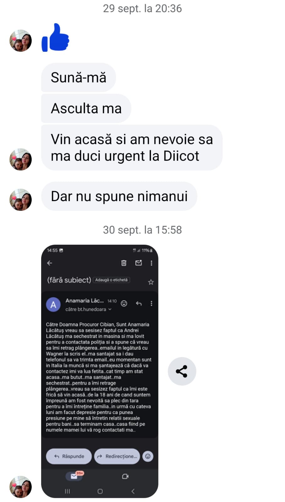 Femeia, aflată în Italia la data de 29 septembrie 2025, i-a cerut disperată ajutorul jurnalistului Robert Wagner, căruia i-a trimis o serie de înregistrări și capturi de ecran. Printre acestea se numără și un mesaj trimis prin e-mail către DIICOT – Biroul Teritorial Hunedoara, în care relata în detaliu abuzurile suferite.