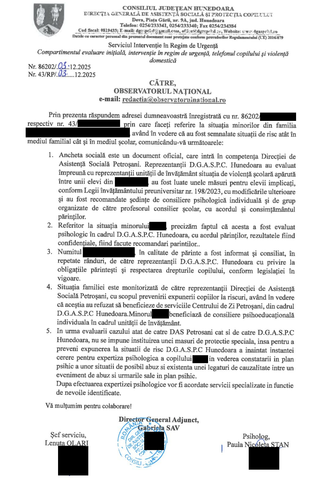 Direcția Generală de Asistență Socială și Protecția Copilului Hunedoara a transmis un răspuns oficial către Observatorul Național TV privind situația unei familii din Petroșani, subiect discutat recent și în ședința Consiliului Local. Documentul confirmă intervenția instituției și măsurile dispuse în urma evaluărilor efectuate atât în mediul familial, cât și în mediul școlar.