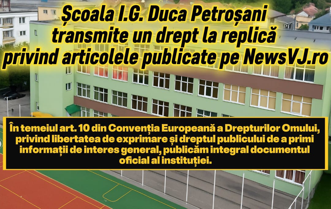 Conducerea Școlii I.G. Duca Petroșani a transmis către Observatorul Național TV un drept la replică referitor la mai multe materiale publicate pe site-ul NewsVJ.ro. În temeiul art. 10 din Convenția Europeană a Drepturilor Omului, privind libertatea de exprimare și dreptul publicului de a primi informații de interes general, publicăm integral documentul oficial al instituției.
